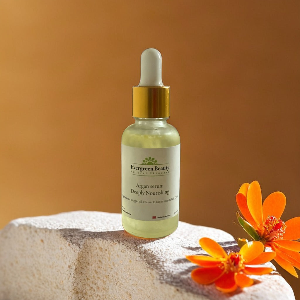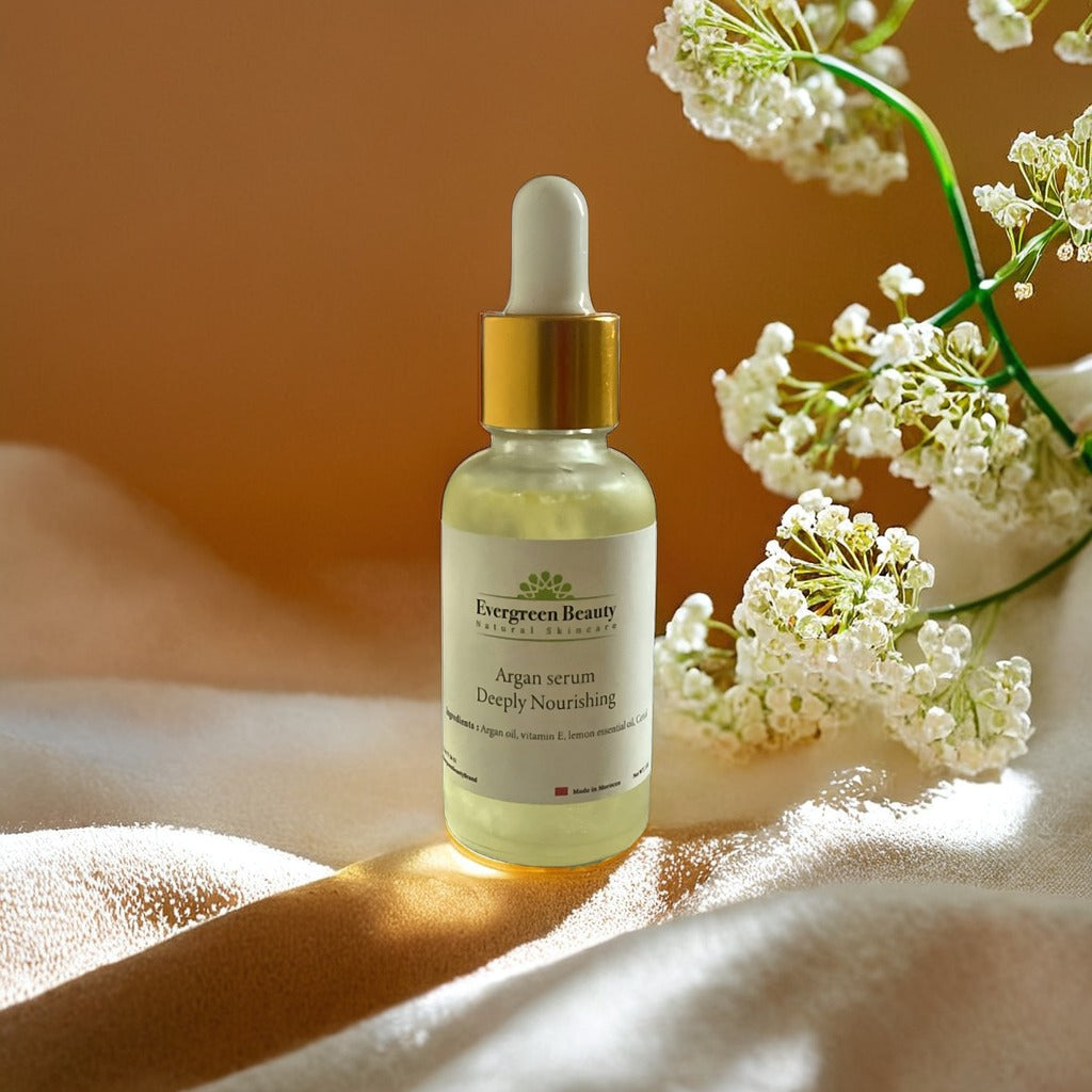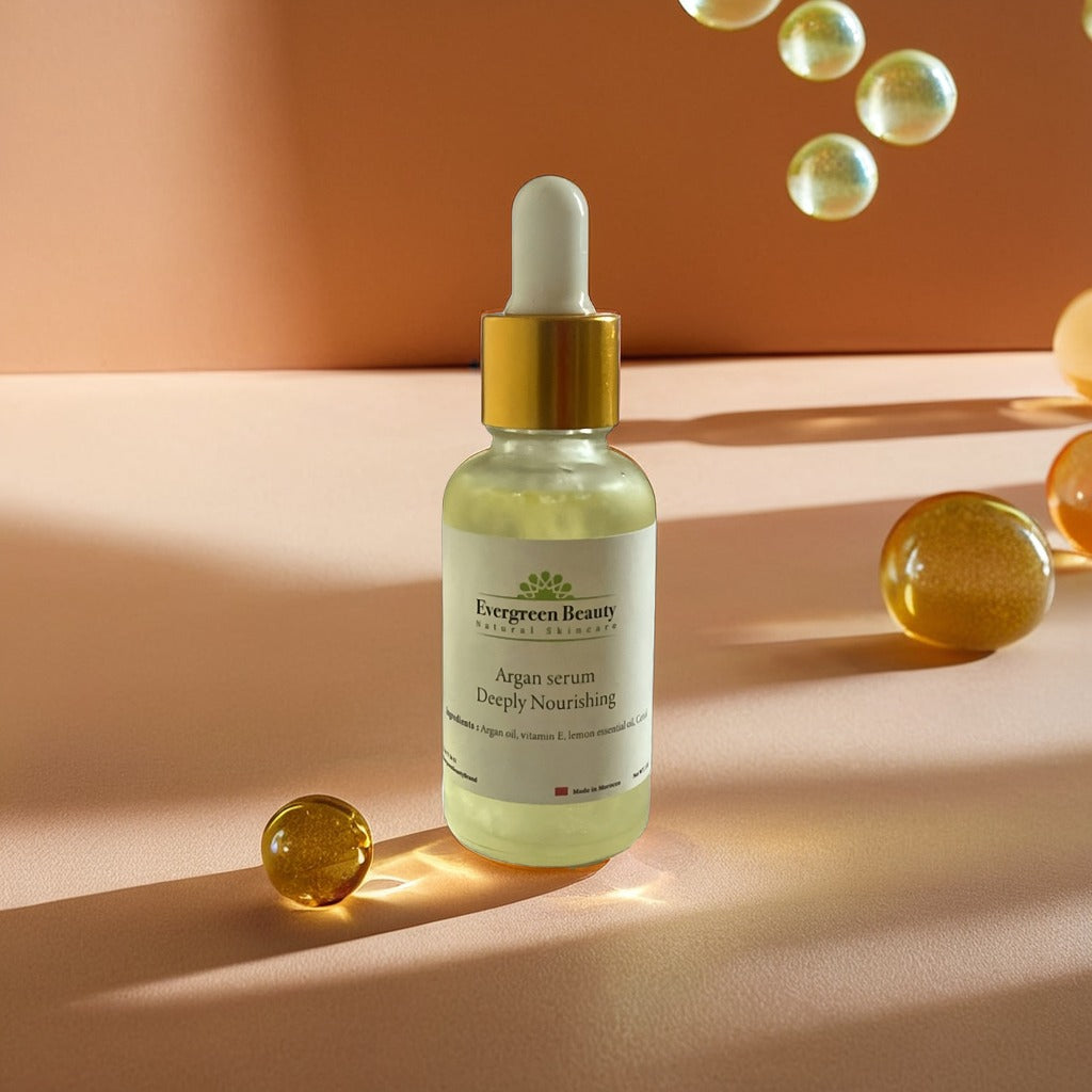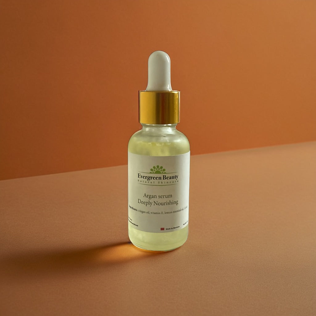 Argan Serum with Vitamin E, experience the beauty benefits of Moroccan argan oil. This natural oil has been used for centuries for its moisturizing and nourishing properties. Use it on skin for a nourished and radiant glowing skin.