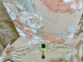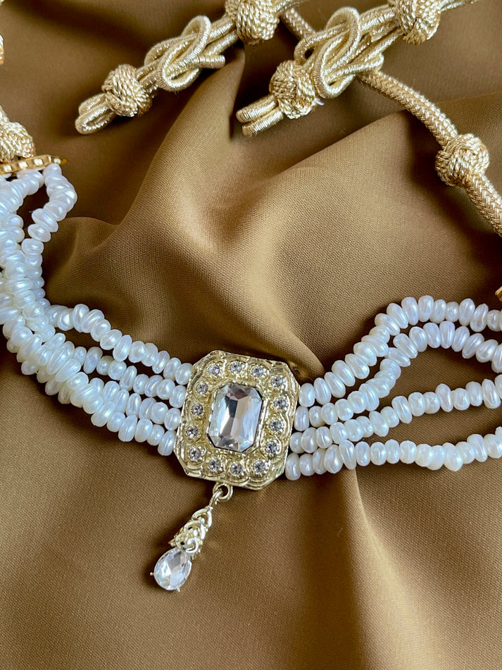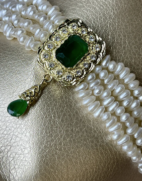 This elegant piece features luminous white beads complemented by a regal Malaki-inspired design, making it a perfect accessory for both traditional and modern outfits.